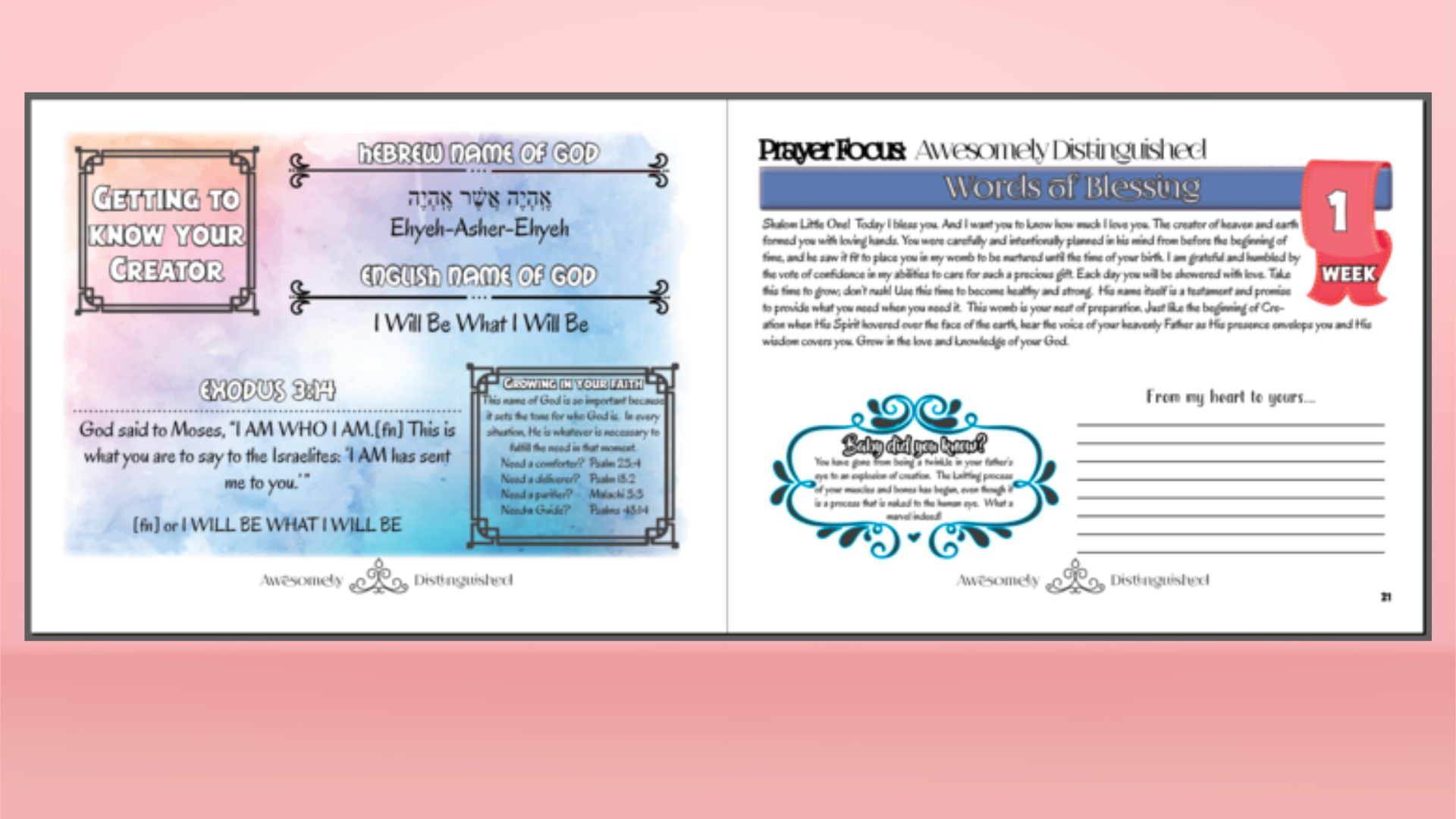 A literary experience for both mother and child. Awesomely Distinguished is an interactive way to teach your child, from the womb, to develop a meaningful relationship with God. With blessings that target positive character traits for each week and information regarding the attributes of God that correspond with each one, you'll give your baby the best start for a purpose-filled meaningful life!