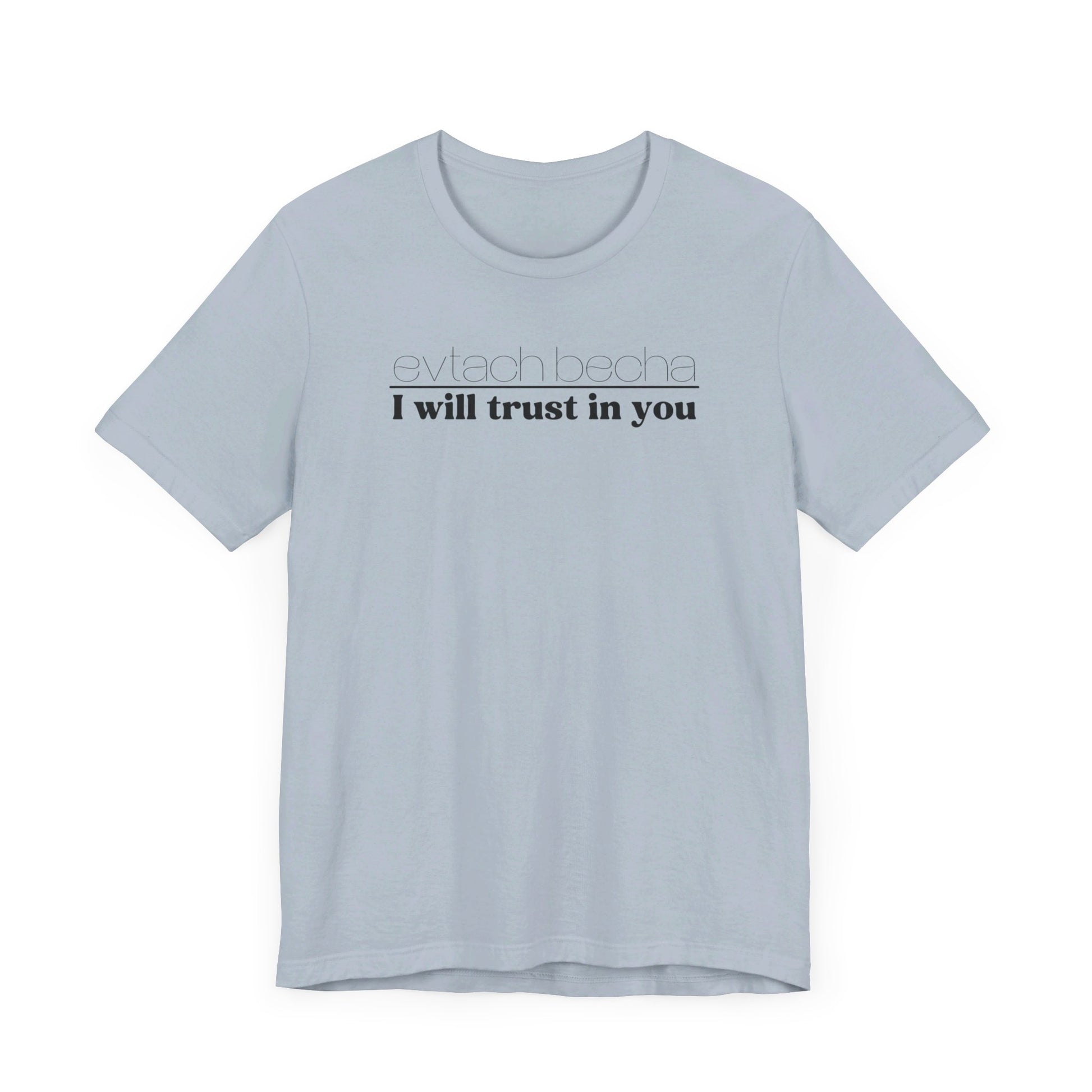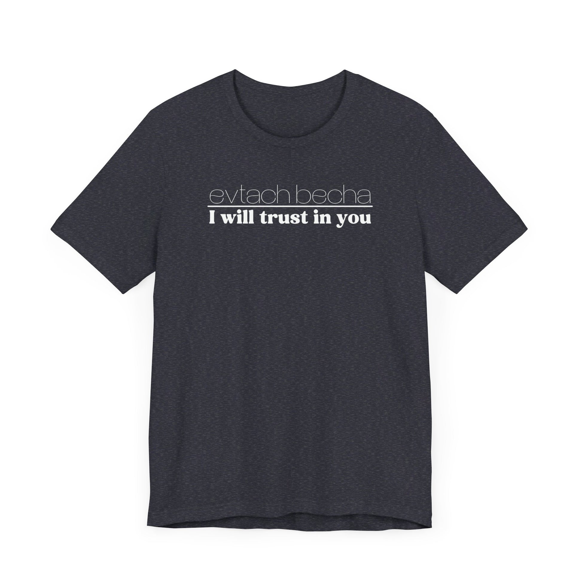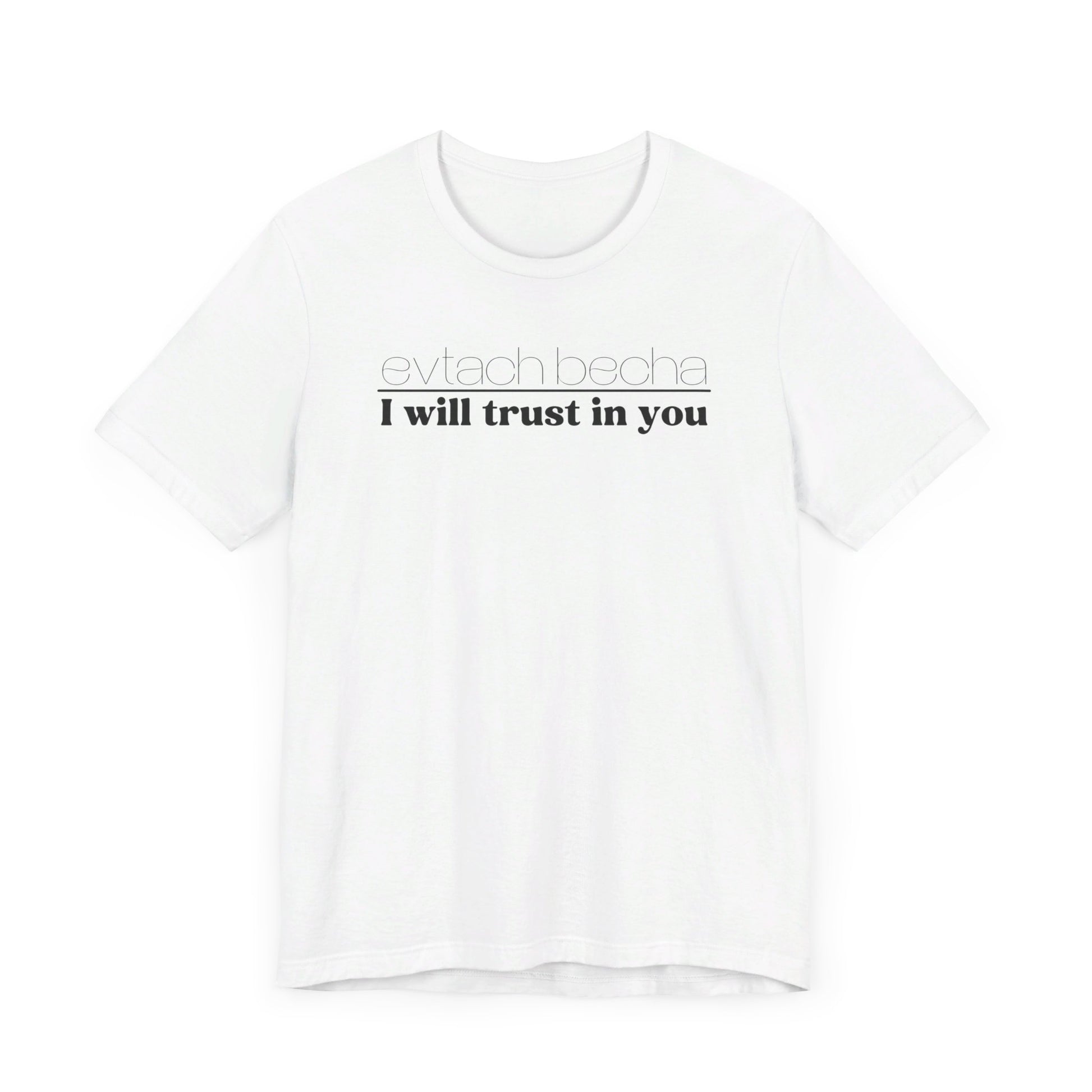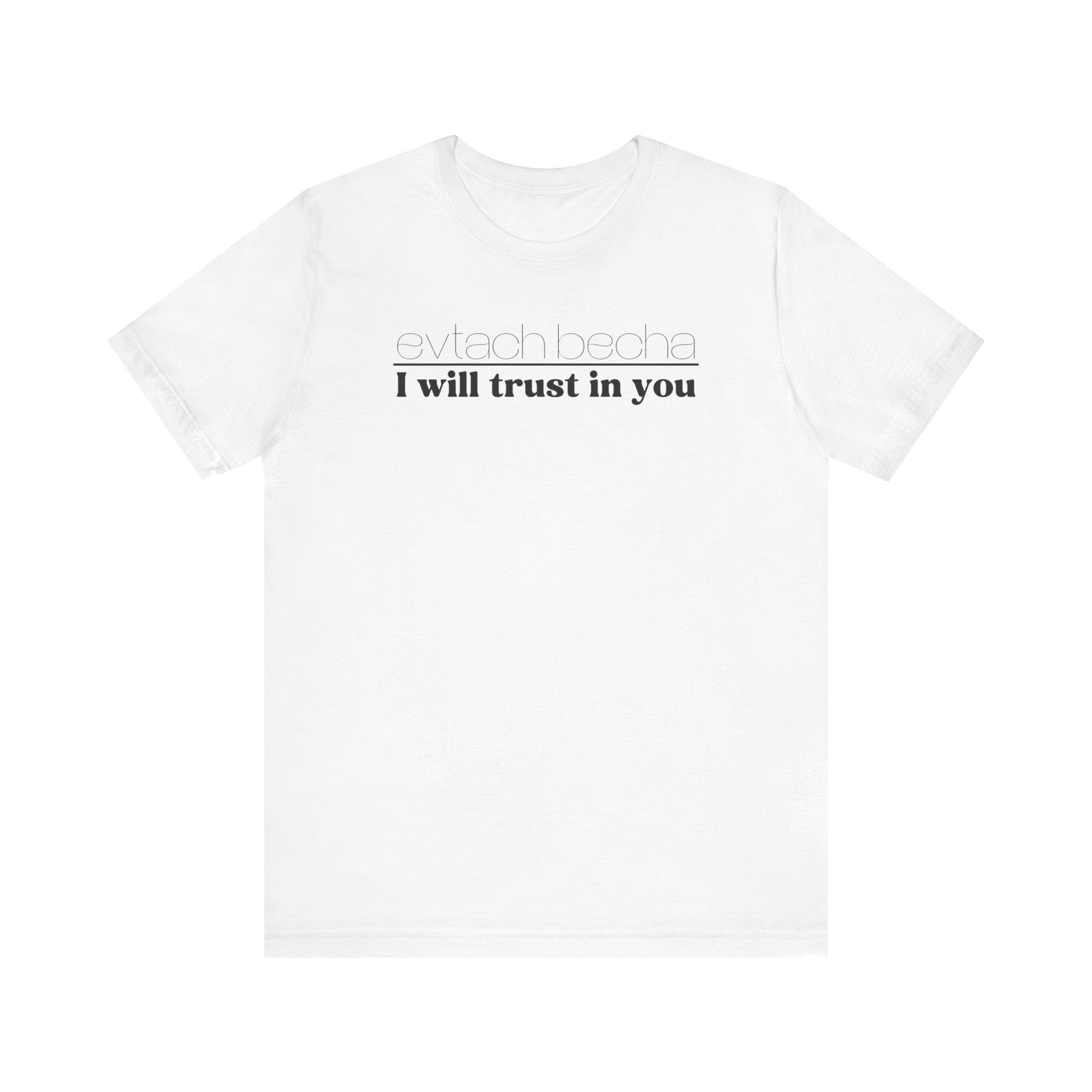 Introducing EVTACH BECHA , a new addition to Audience of One Creations' 2023 Tee Collection. The EVTACH BECHA Tee is perfect for those who want to express their trust in God with style! This shirt features the phrase “I WILL TRUST IN YOU” in bold letters, along with its Hebrew translation, reminding us to trust in God, the ONE who holds us in the palm of His hand. The Hebrew language is the one God chose to share His heart and Word. The EVTACH BECHA allows the wearer to share this important faith truth with the world in a simple yet eye-catching design. It makes a great conversation starter for those who want to share their faith with others. It's also a perfect gift for anyone who appreciates the power of faith and complete trust in God.