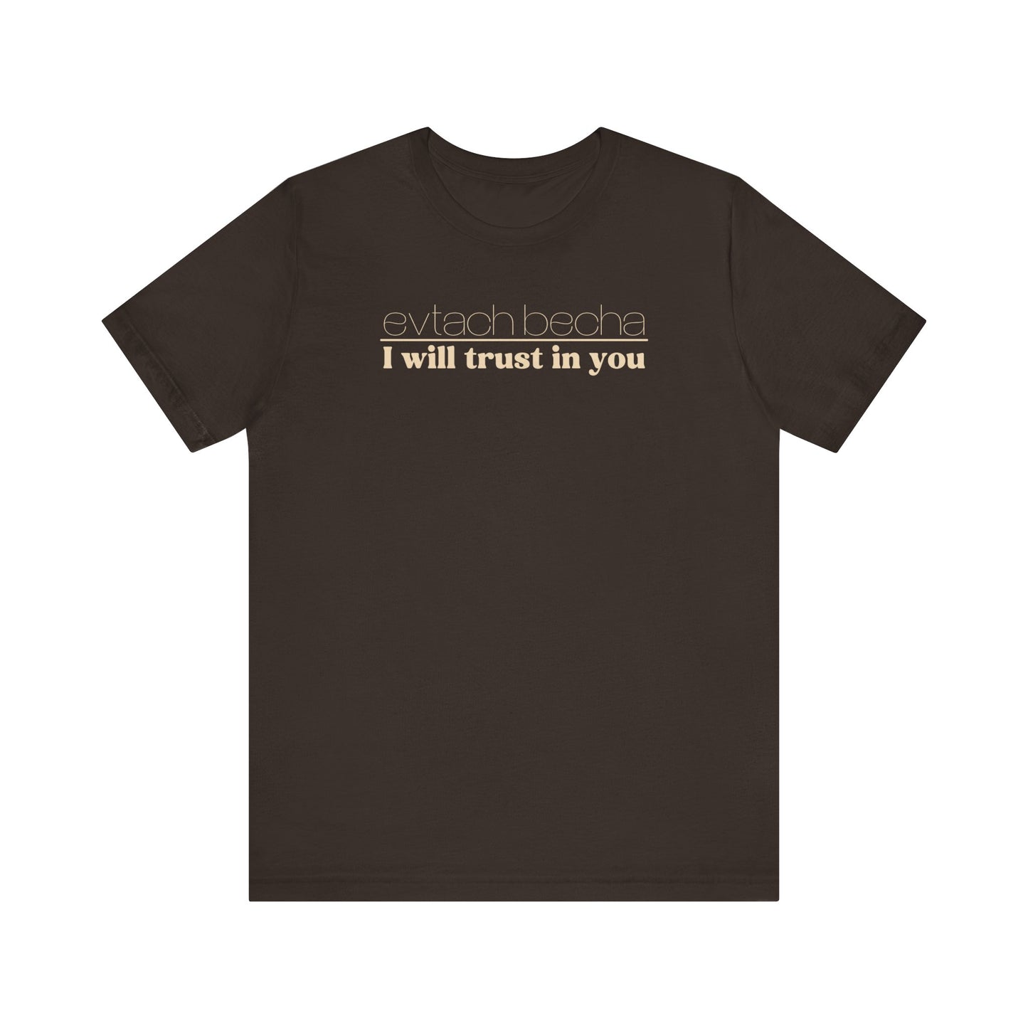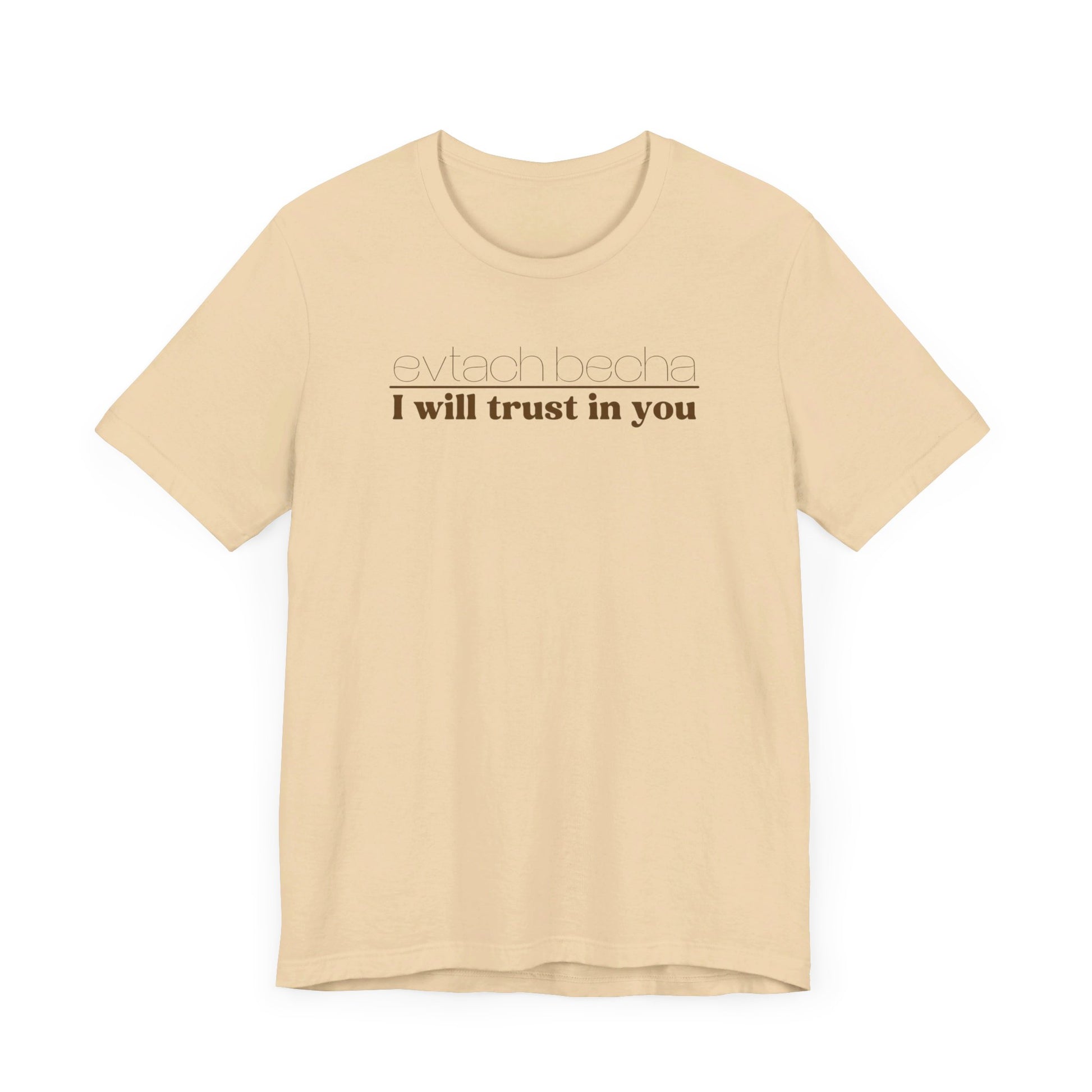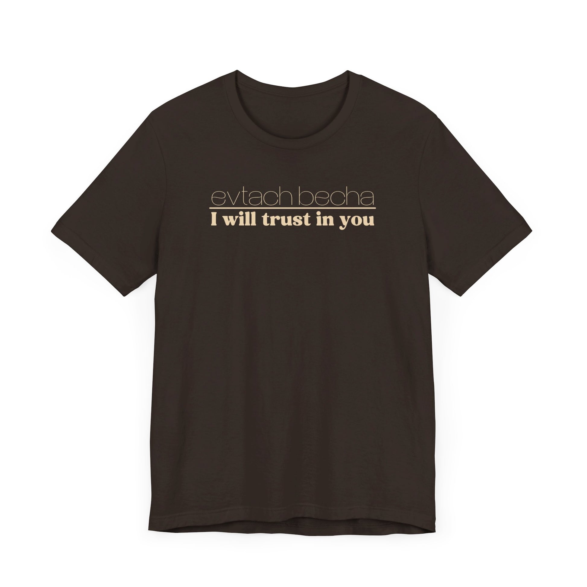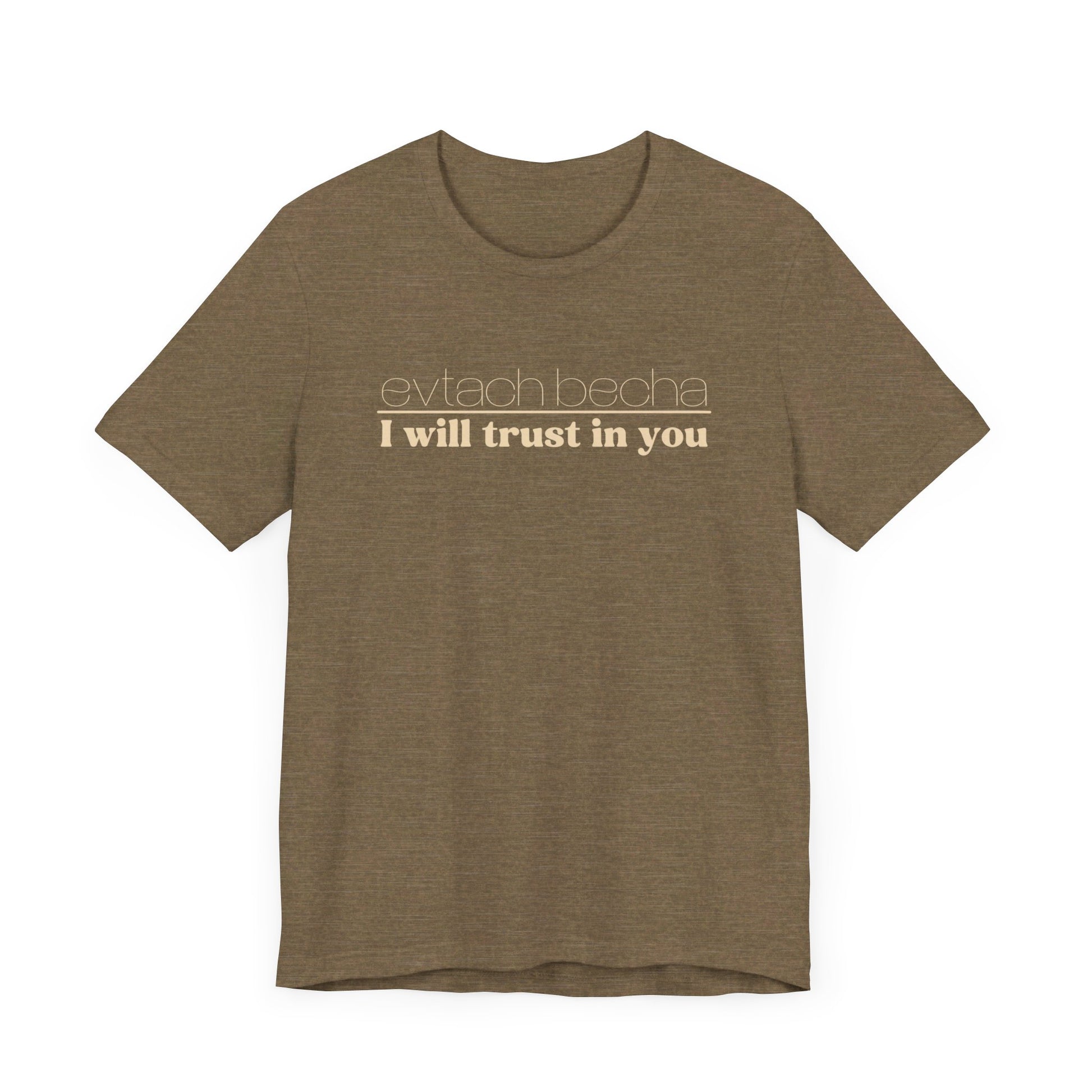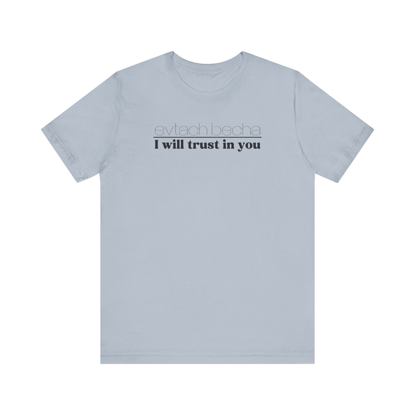 Introducing EVTACH BECHA , a new addition to Audience of One Creations' 2023 Tee Collection. The EVTACH BECHA Tee is perfect for those who want to express their trust in God with style! This shirt features the phrase “I WILL TRUST IN YOU” in bold letters, along with its Hebrew translation, reminding us to trust in God, the ONE who holds us in the palm of His hand. The Hebrew language is the one God chose to share His heart and Word. The EVTACH BECHA allows the wearer to share this important faith truth with the world in a simple yet eye-catching design. It makes a great conversation starter for those who want to share their faith with others. It's also a perfect gift for anyone who appreciates the power of faith and complete trust in God.