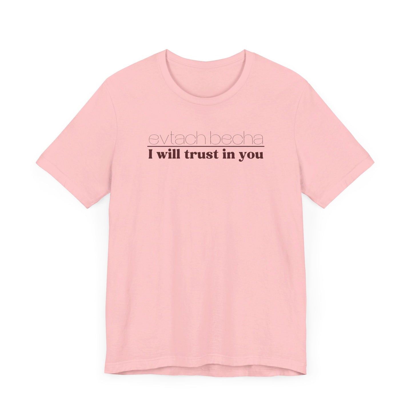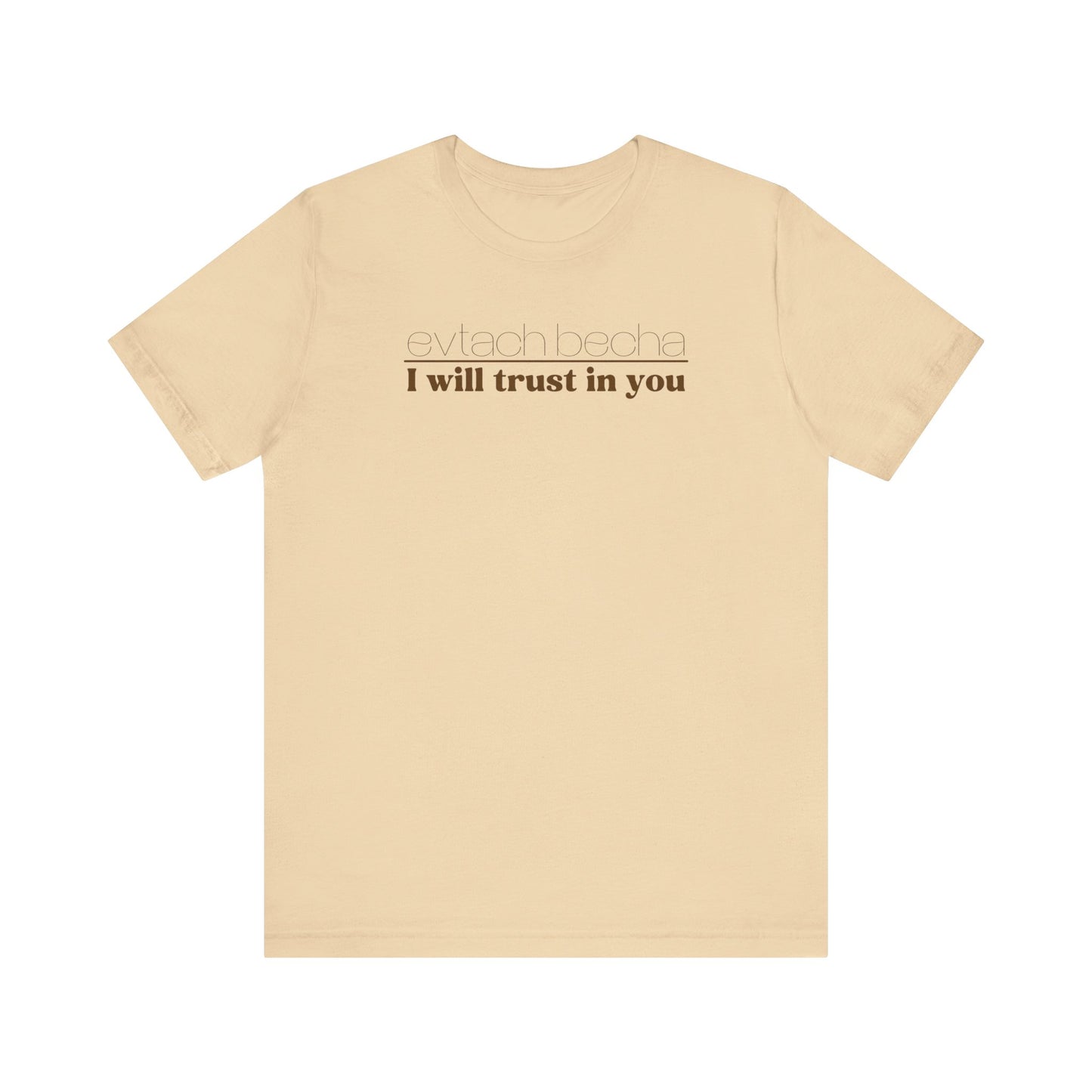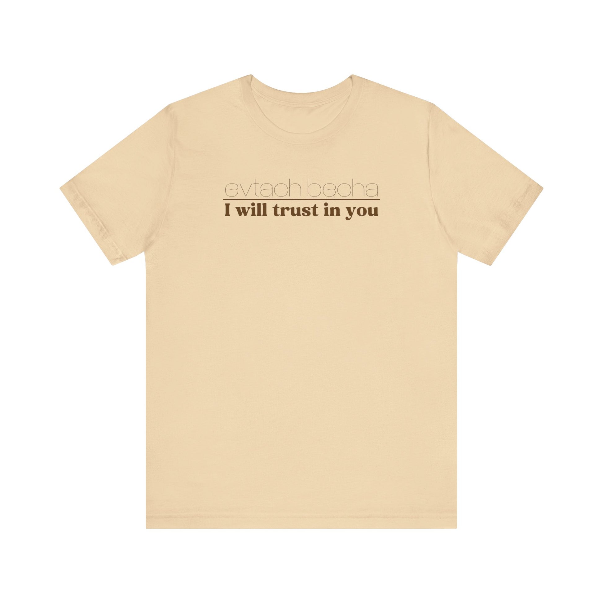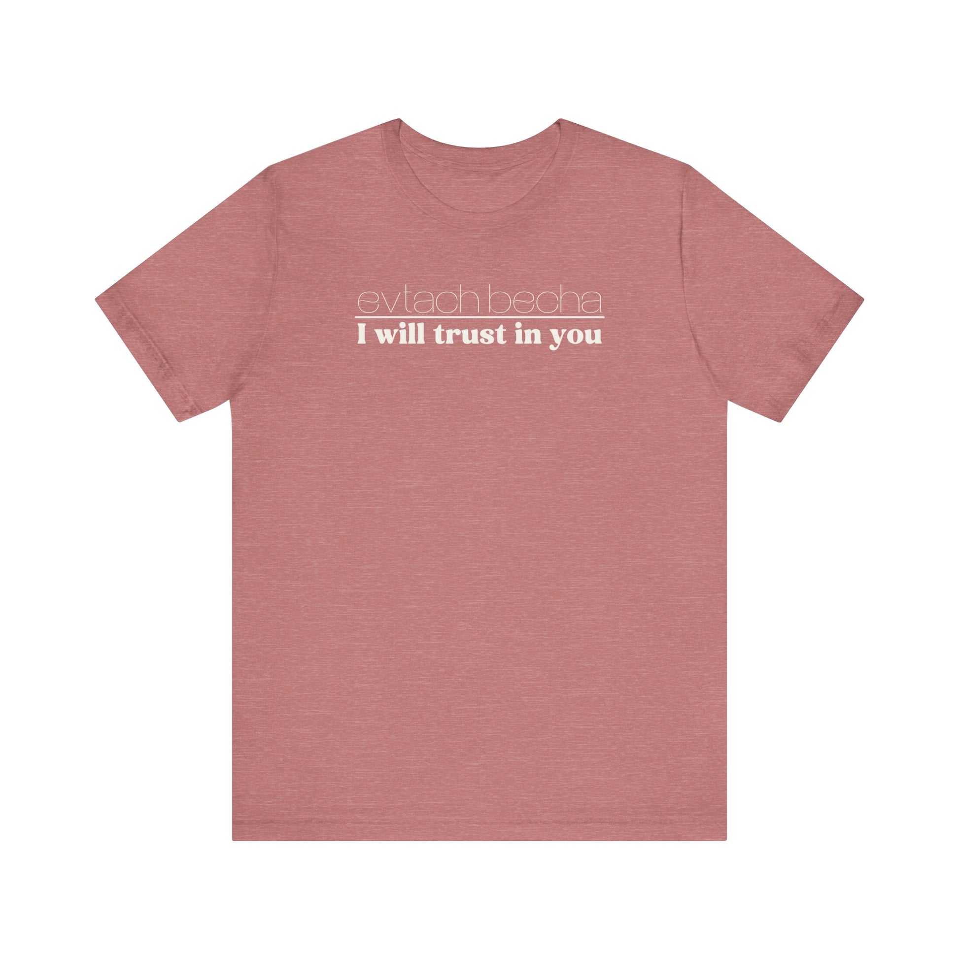 Introducing EVTACH BECHA , a new addition to Audience of One Creations' 2023 Tee Collection. The EVTACH BECHA Tee is perfect for those who want to express their trust in God with style! This shirt features the phrase “I WILL TRUST IN YOU” in bold letters, along with its Hebrew translation, reminding us to trust in God, the ONE who holds us in the palm of His hand. The Hebrew language is the one God chose to share His heart and Word. The EVTACH BECHA allows the wearer to share this important faith truth with the world in a simple yet eye-catching design. It makes a great conversation starter for those who want to share their faith with others. It's also a perfect gift for anyone who appreciates the power of faith and complete trust in God.