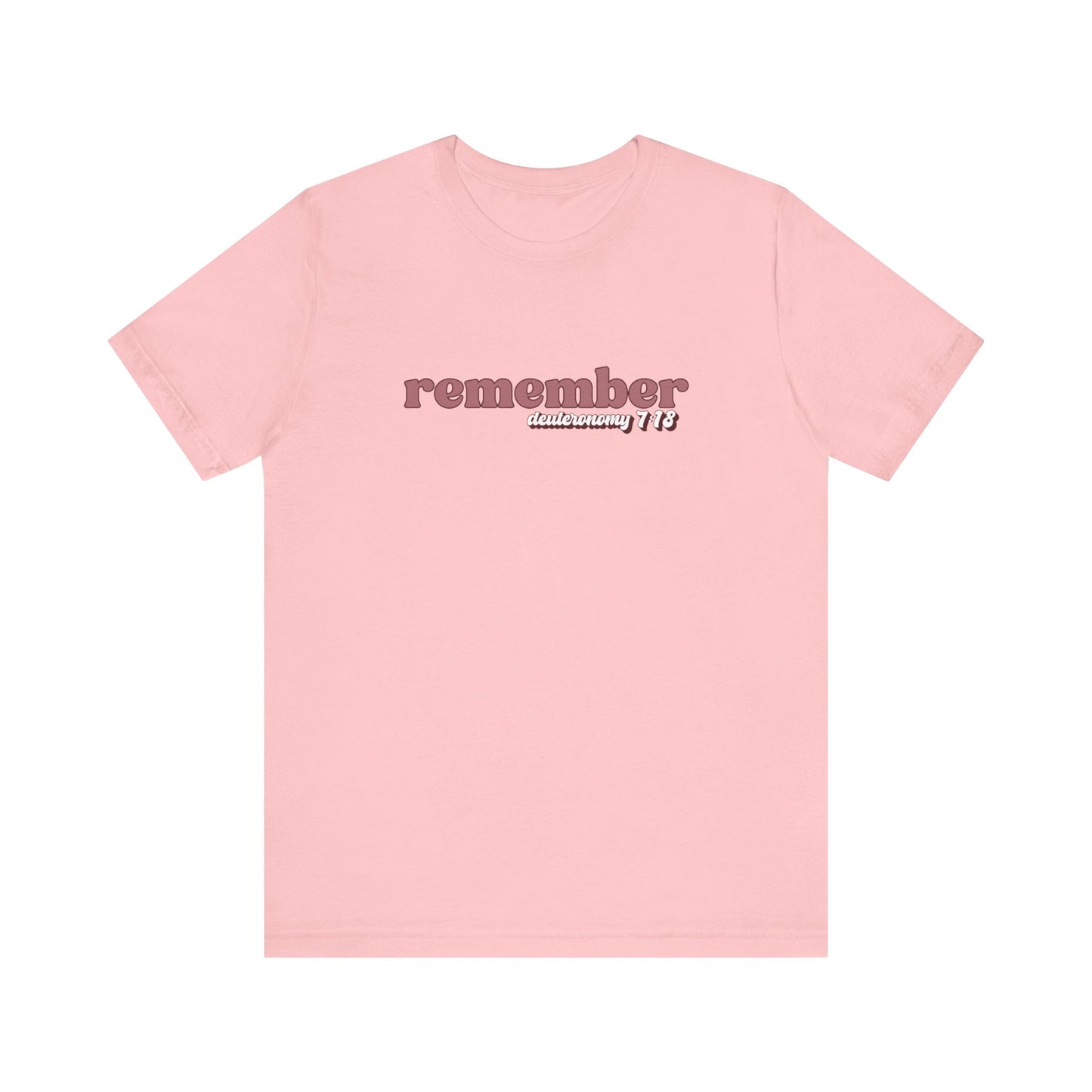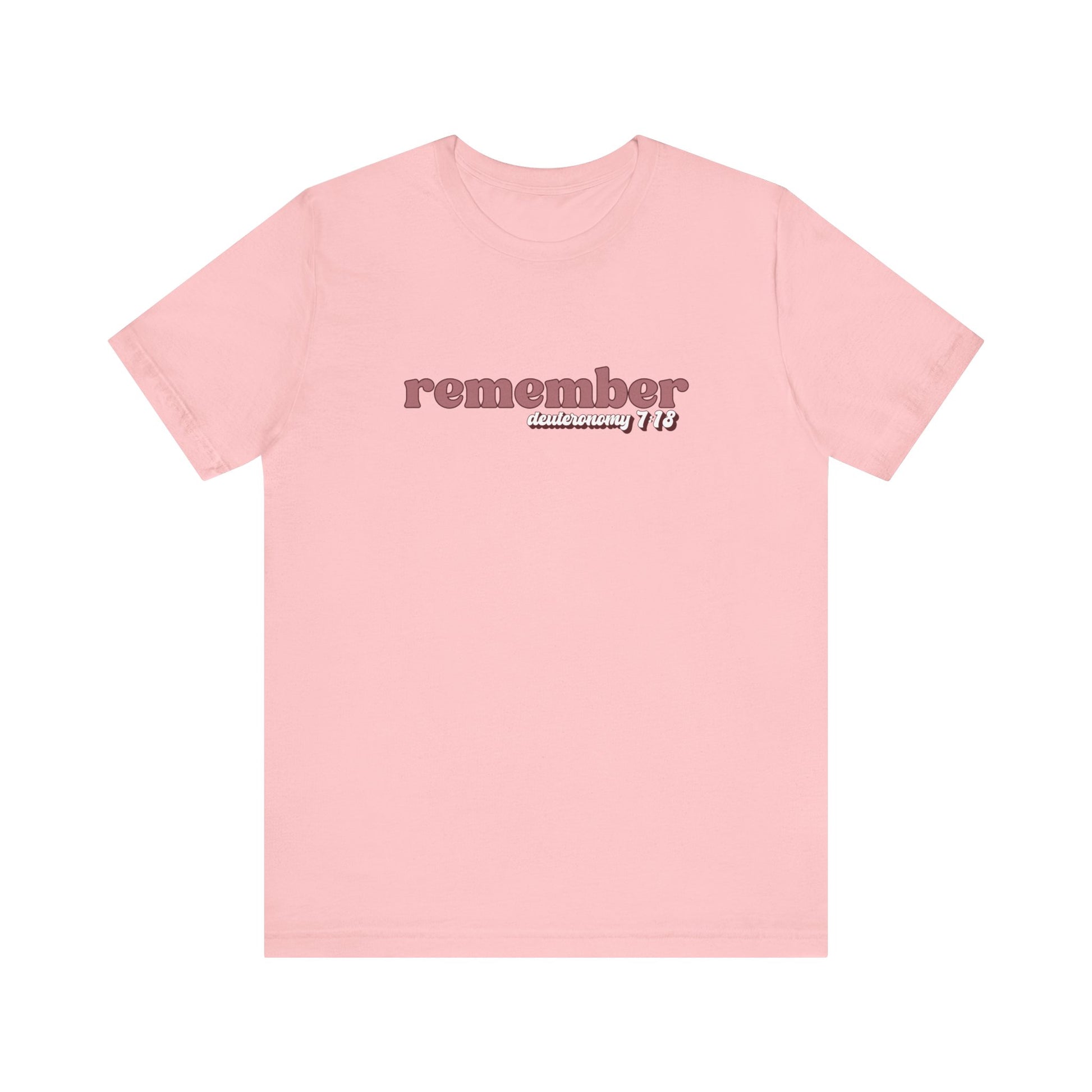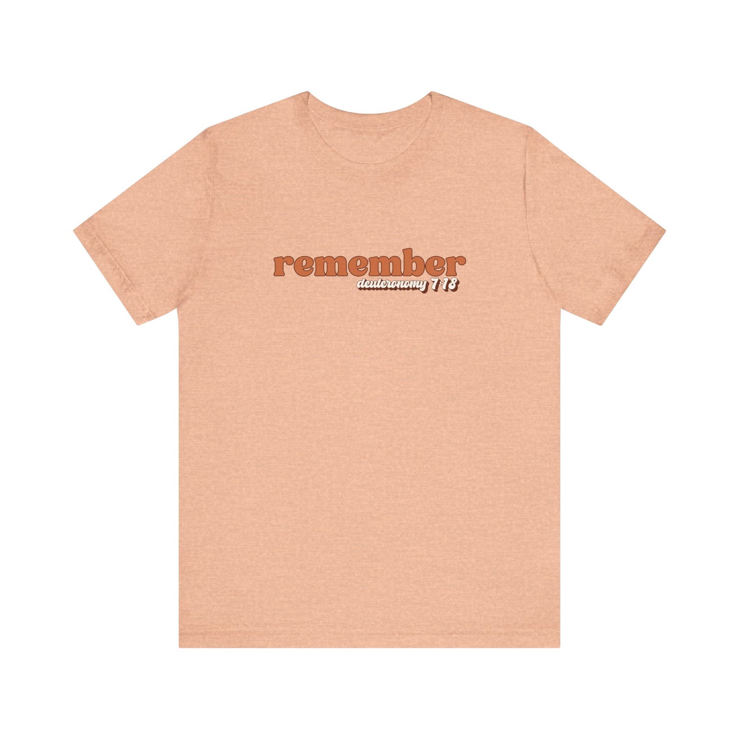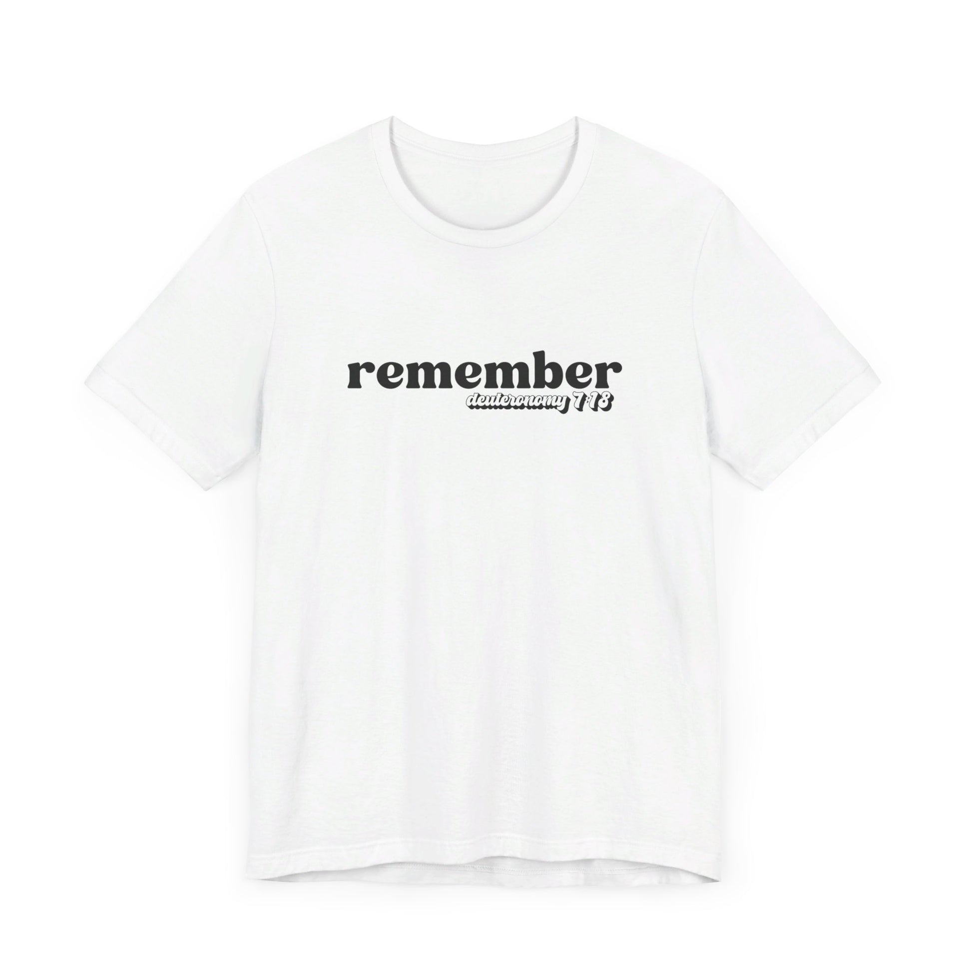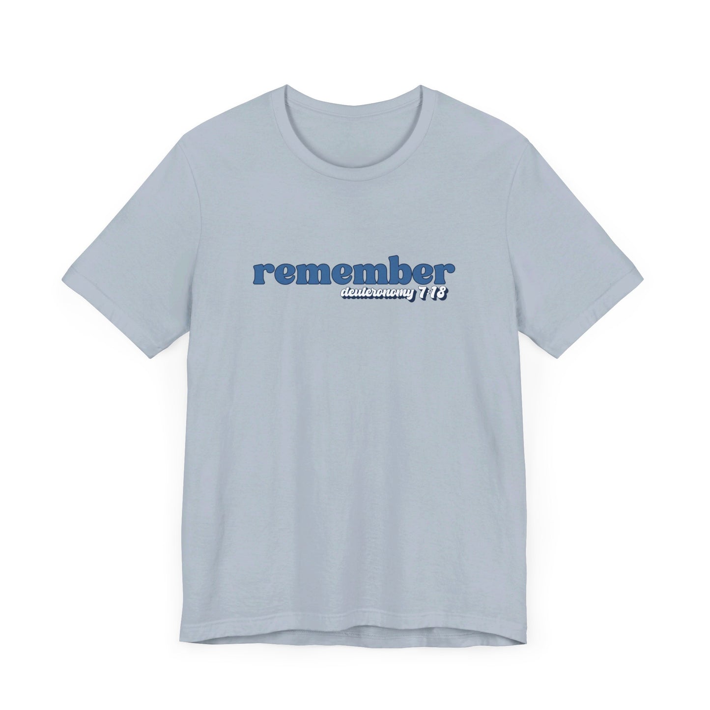 Introducing REMEMBER , a new addition to Audience of One Creations' 2023 Tee Collection. The REMEMBER Tee is perfect for those who want to express their trust in God with style! This shirt features the phrase “Remember” in bold letters and it comes from Deuteronomy 7:18. This passage highlights how God told His people that when they saw difficult situations and troubles to remember how He showed up in the past. It’s a reminder that if He did it before He is faithful to do it AGAIN! The REMEMBER allows the wearer to share this important faith truth with the world in a simple yet eye-catching design. It makes a great conversation starter for those who want to share their faith with others. It's also a perfect gift for anyone who appreciates the power of faith and complete trust in God.