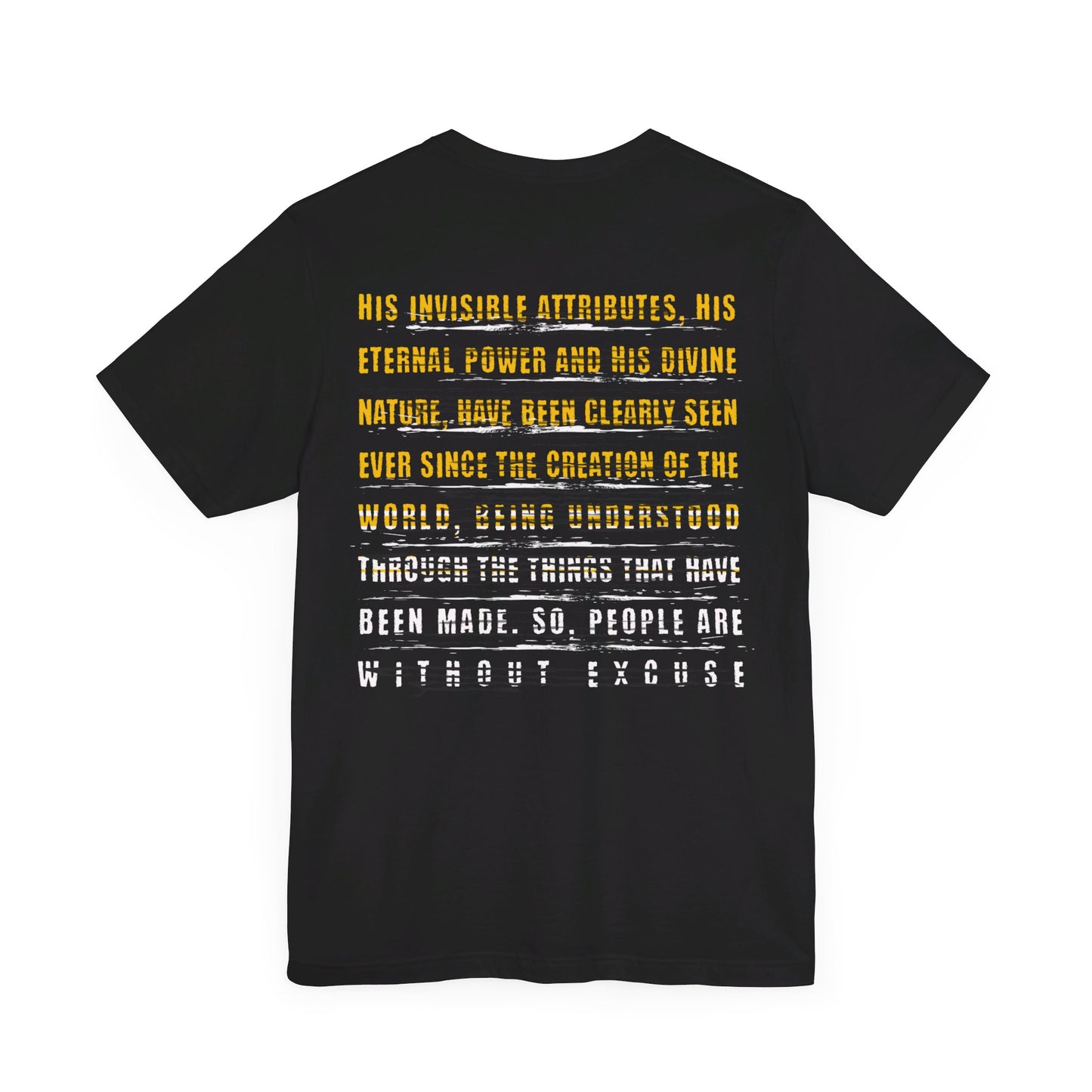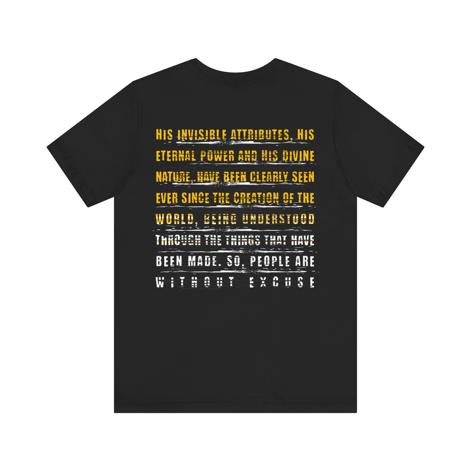 The shirt is made of soft and comfortable cotton, with a classic fit that's suitable for both men and women. Whether you wear it to a worship service, class, or just around town, it's a great way to express your faith in a subtle yet meaningful way. Made with high-quality materials, this shirt is both comfortable and durable, making it perfect for everyday wear. Trust us, when you wear the ROMANS 1:20 Tee, you'll not only look great but feel great too knowing that you're spreading a positive message and showing your love for God!