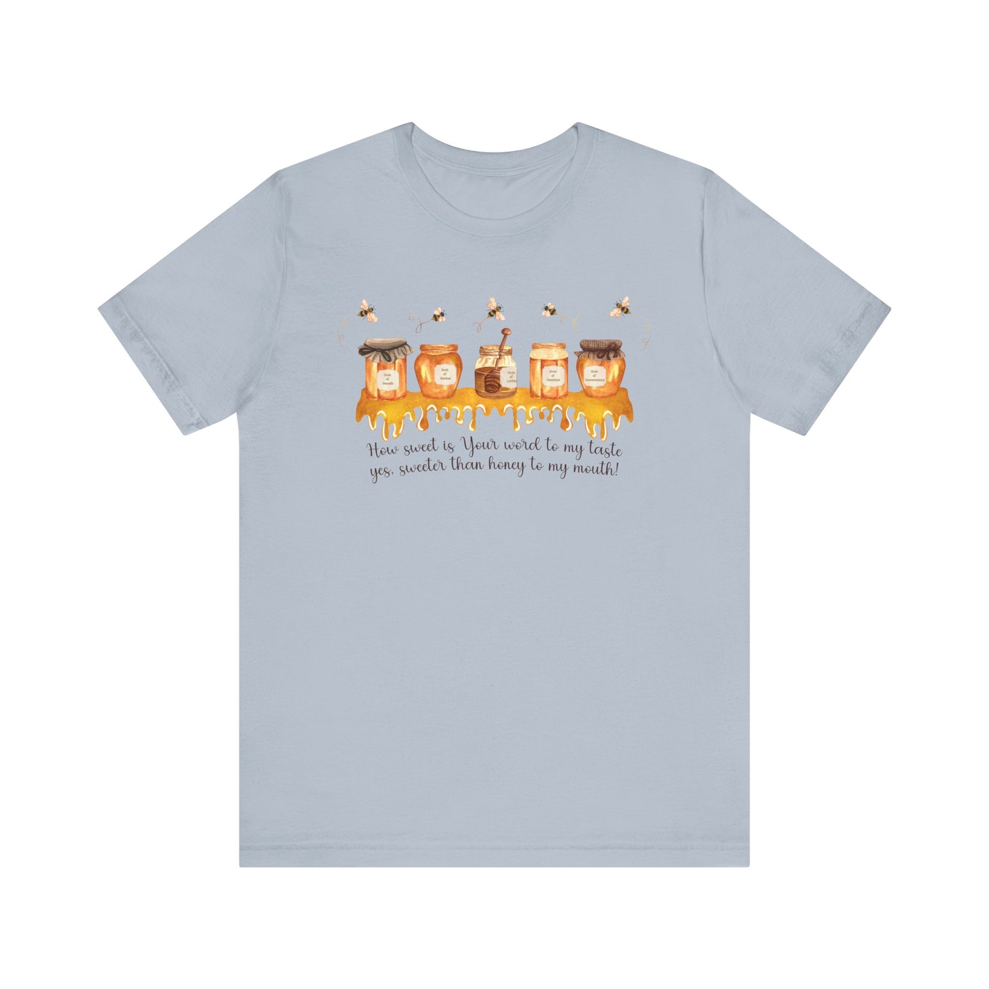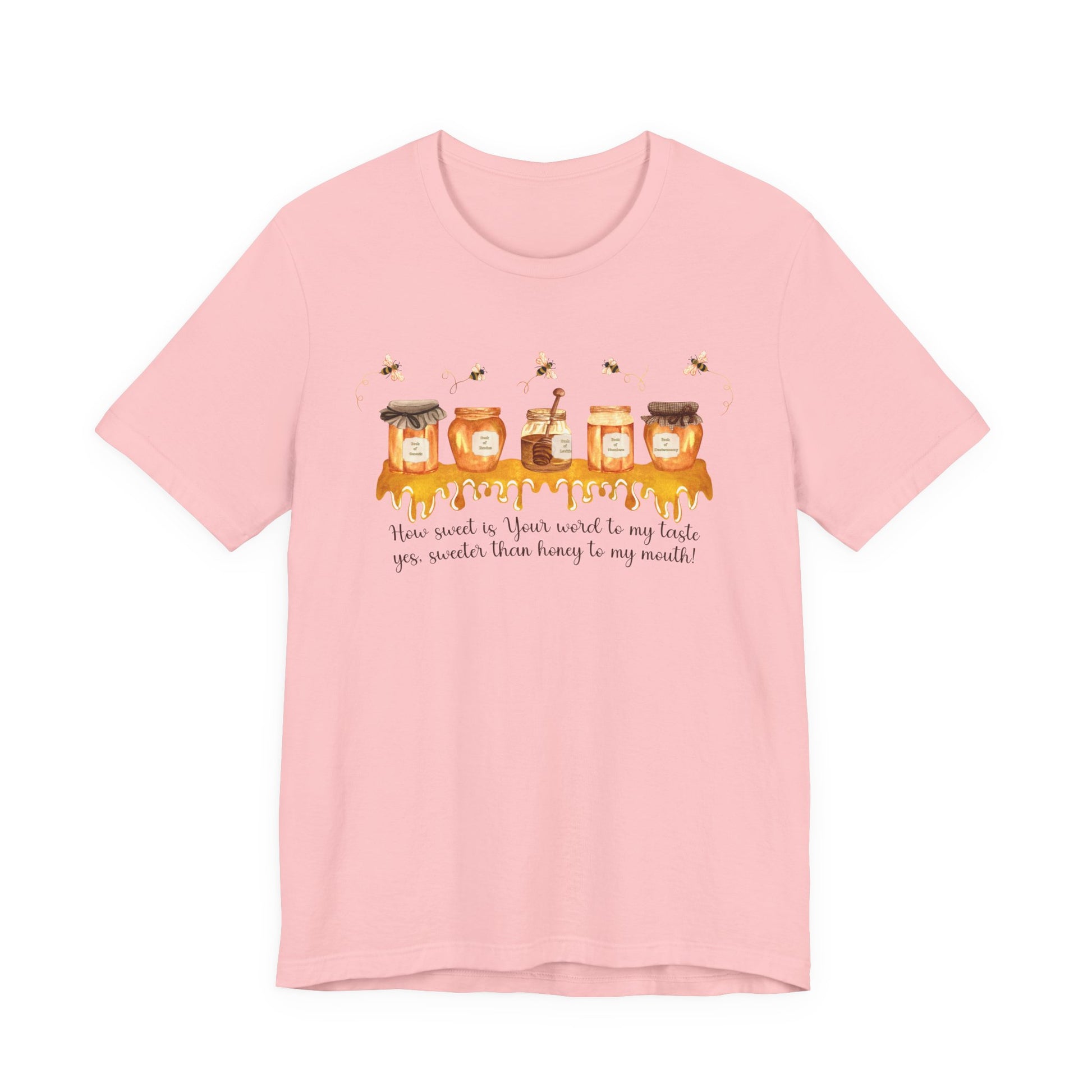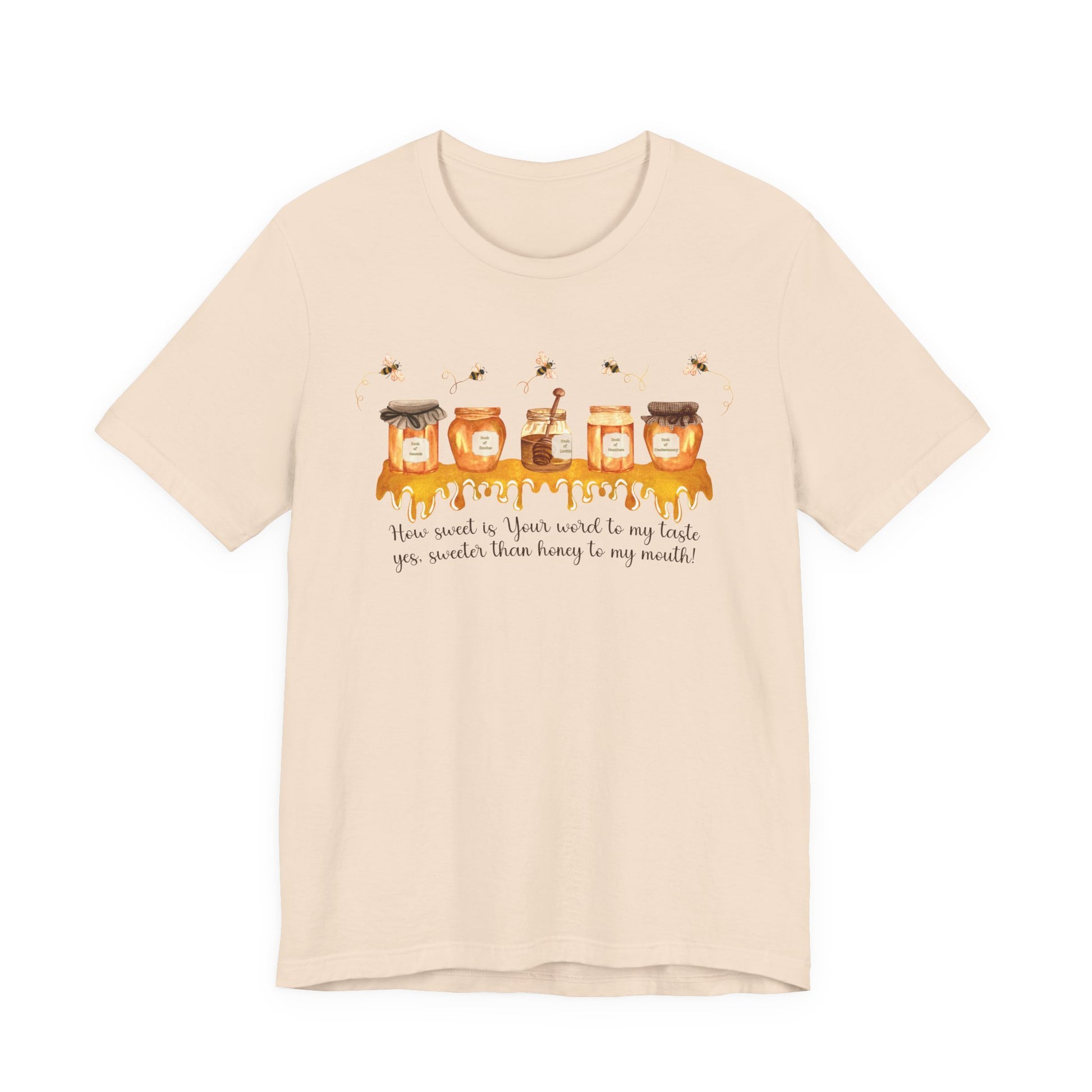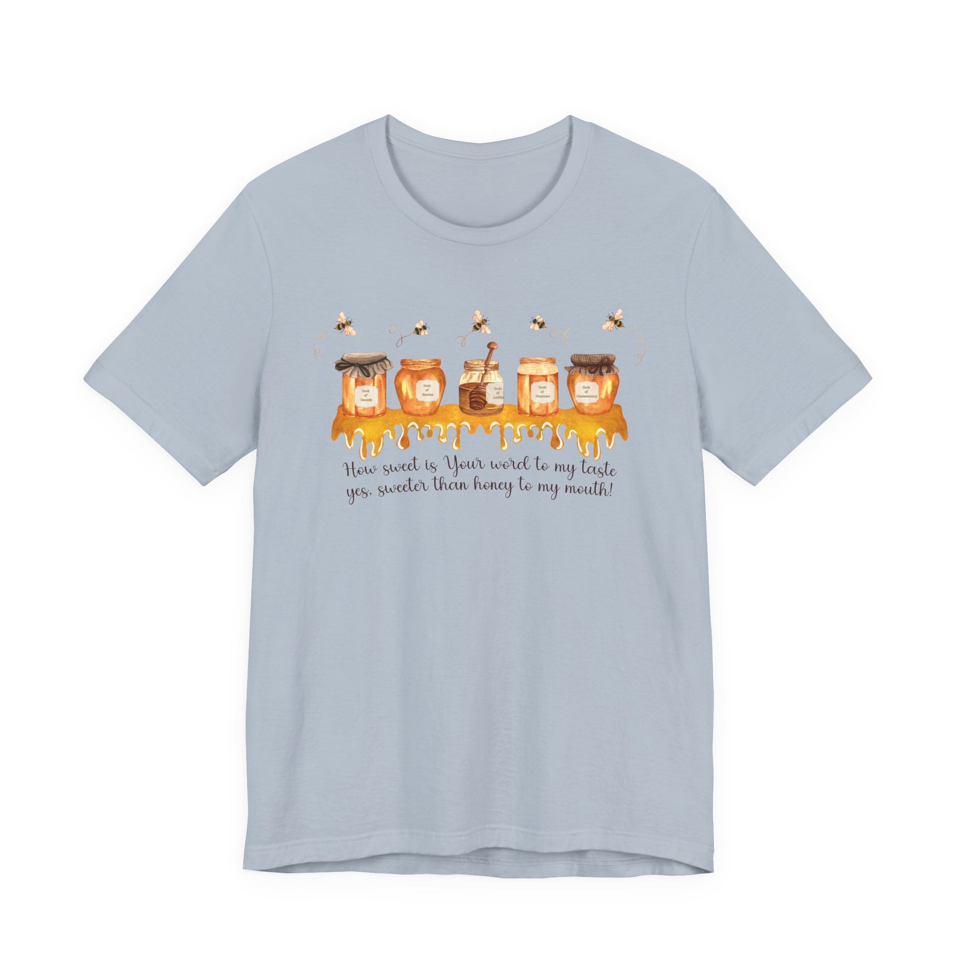 Introducing SHAVUOT HONEY POT , a new addition to Audience of One Creations' 2023 Tee Collection. The SHAVUOT HONEY POT Tee is perfect for those who want to express that connection between receiving God’s word and it being this sweet gift from God. This shirt features the verse from Psalm 119:103,  “How sweet is Your word to my taste. Yes, sweeter than honey to my mouth!”It reminds us that God has gifted us with His Word to walk out our journey in life. Shavuot highlights God’s provision in all things, including His Word.. The SHAVUOT HONEY POT allows the wearer to share this important faith truth with the world in a simple yet eye-catching design. It makes a great conversation starter for those who want to share their faith with others. It's also a perfect gift for anyone who appreciates the gift of God’s provision and His Word.