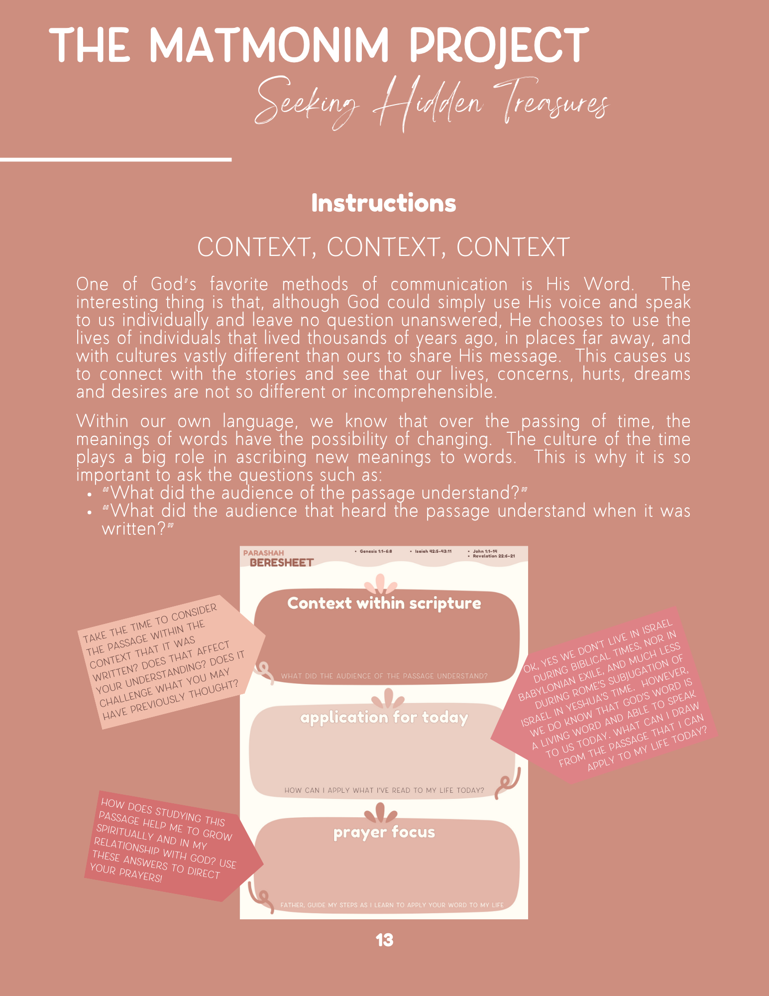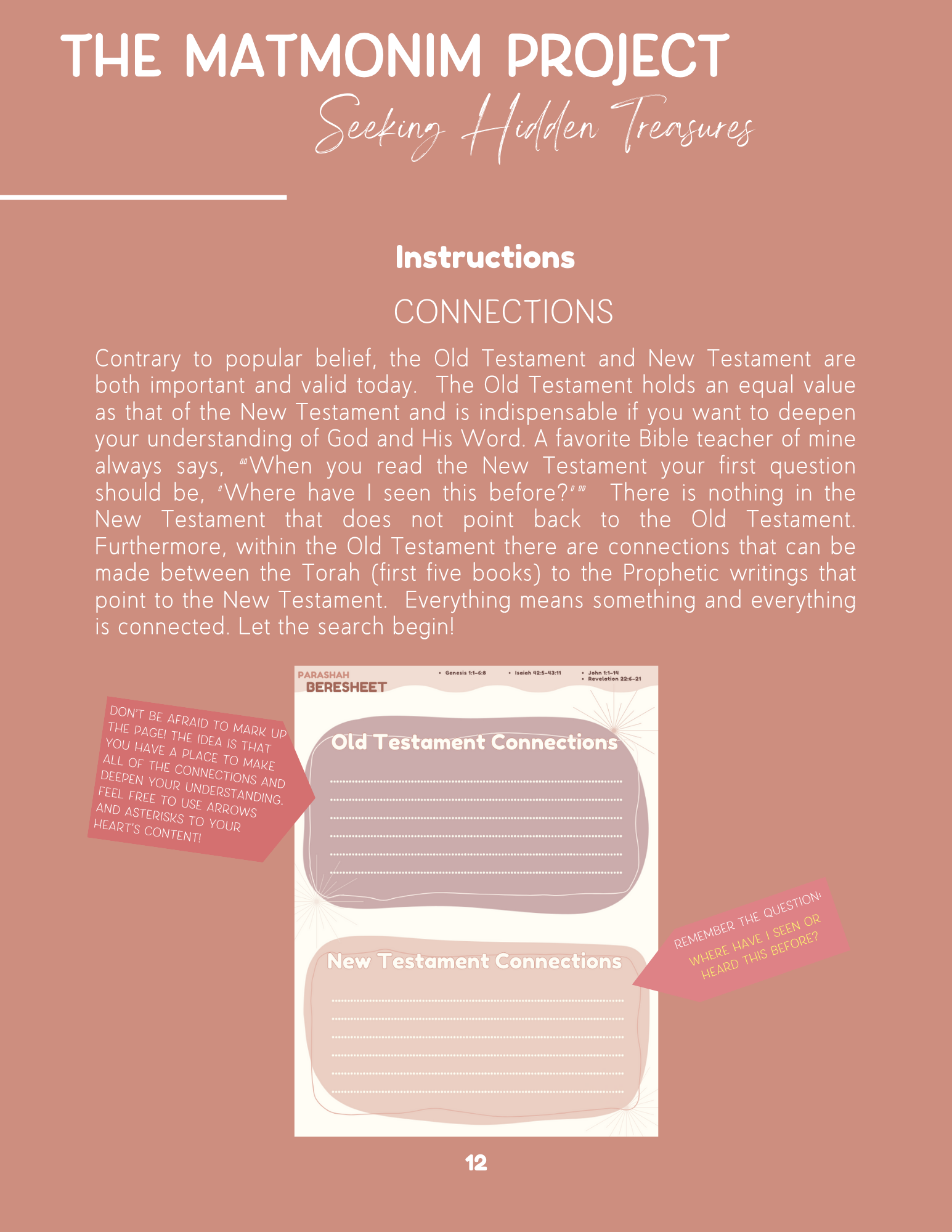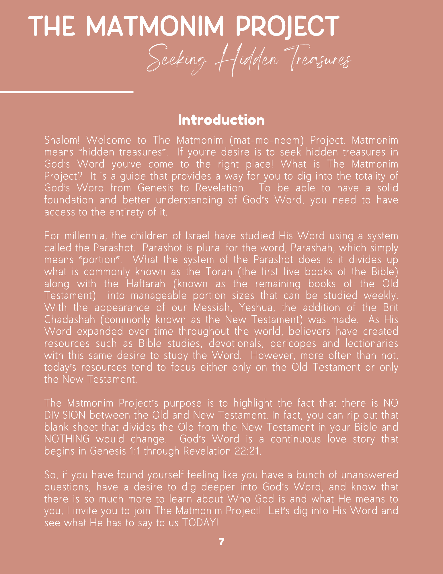 The Matmonim Project is the perfect companion to your Bible study. Using the ancient idea of dividing the Torah (the five books of Moses) along with the Haftarah (the writings of the prophets in the Old Testament) and the Brit Chadashah (the New Testament writings) into manageable portions of study, the Matmonim Project provides you with an interactive and thought-provoking way to take a look at the Old Testament and the New Testament each week. This method of studying encourages asking questions, searching God out in your time of meditation and study, and strengthening your faith in the Word. It’s all about making connections and seeing God in the whole of Scripture. Let the journey begin!