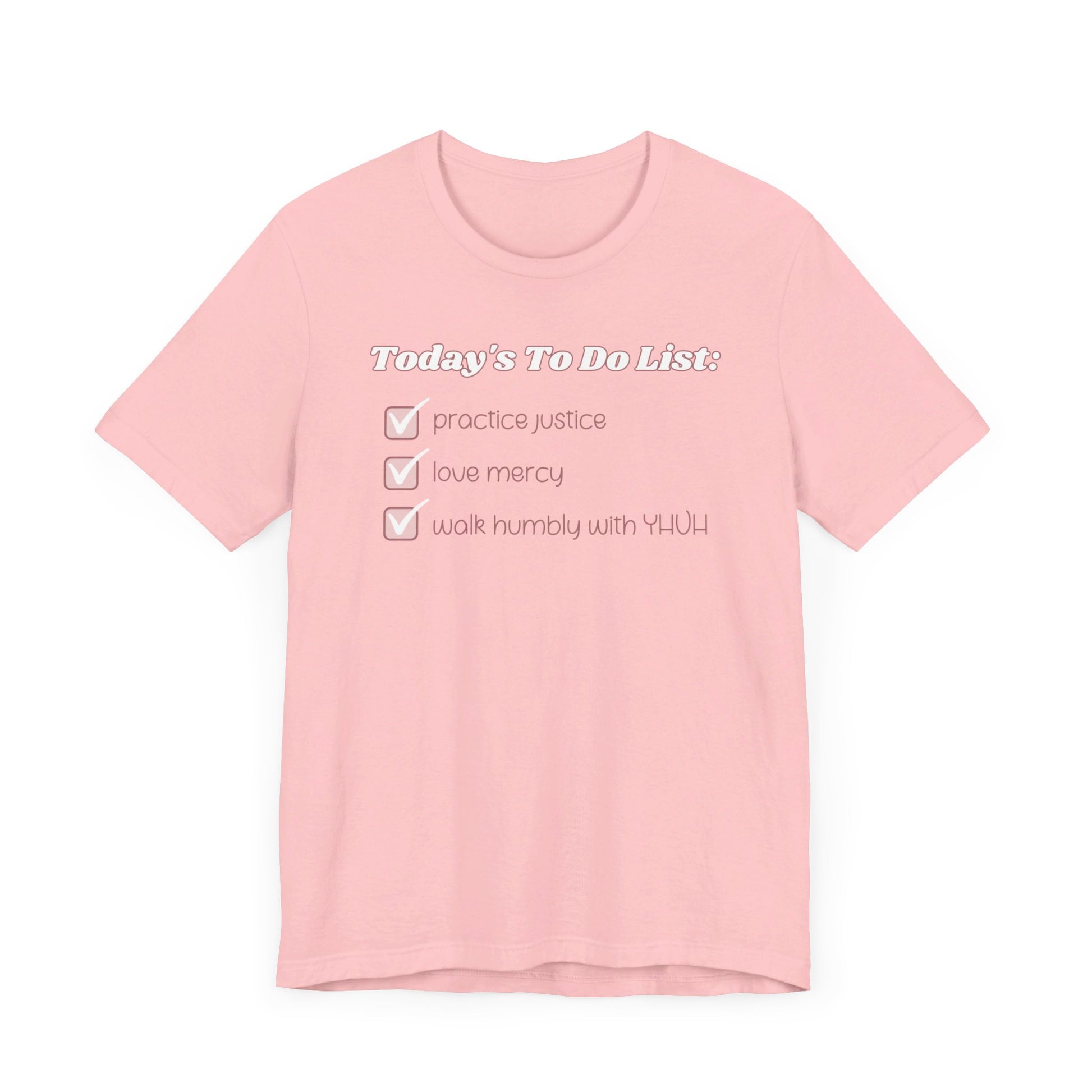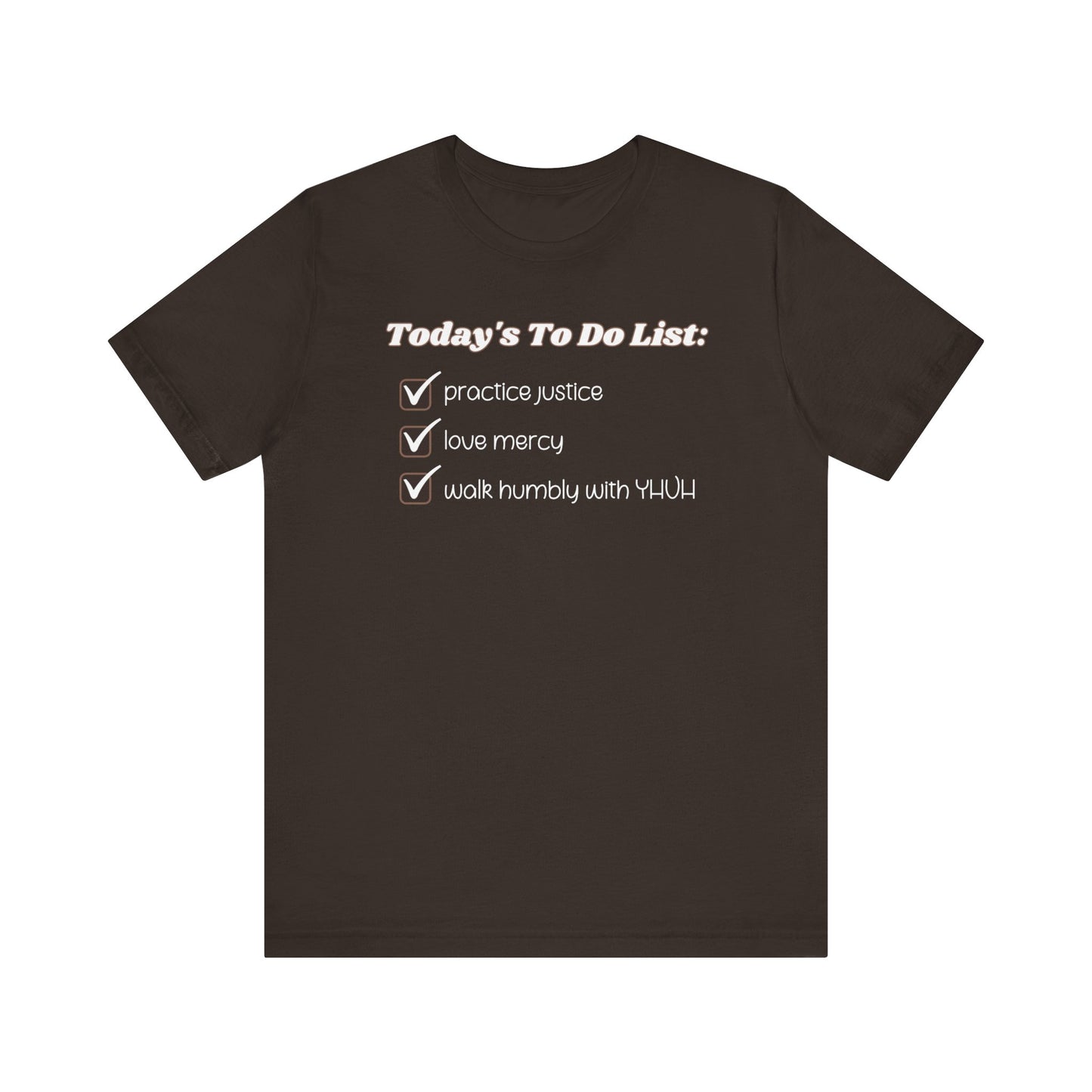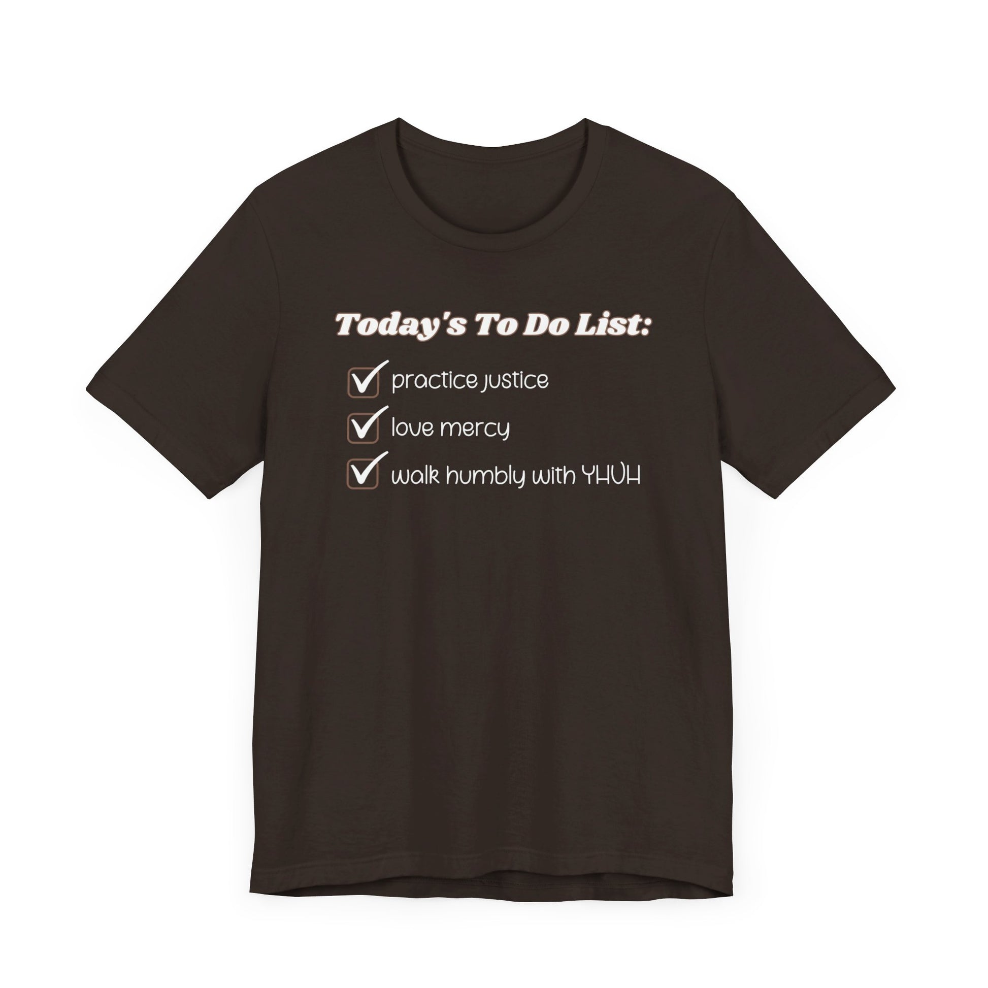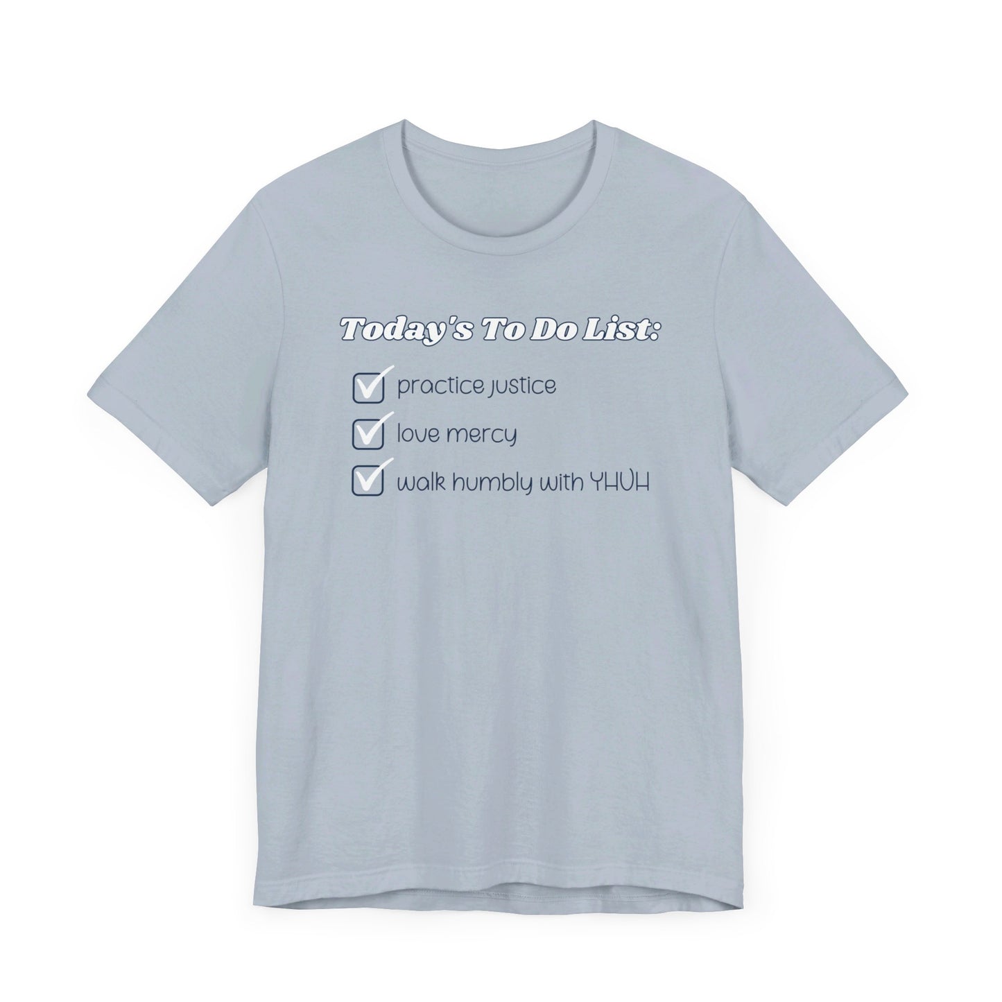 The shirt is made of soft and comfortable cotton, with a classic fit that's suitable for both men and women. Whether you wear it to a worship service, class, or just around town, it's a great way to express your faith in a subtle yet meaningful way. Made with high-quality materials, this shirt is both comfortable and durable, making it perfect for everyday wear. Trust us, when you wear the TODO LIST Tee, you'll not only look great but feel great too knowing that you're spreading a positive message and showing your love for God!